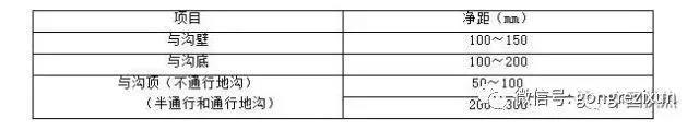 11.地沟内的管道安装位置,其净距(保温层外表面)应符合下表规定。