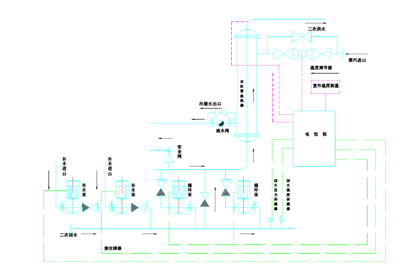 二次网路的回水经过除污器,流入二次网路循环泵,(双循环泵时一台工作,一台备用;三循环泵时二台工作,一台备用);加压后进入水——水双纹管换热器,与一次网的热水进行热交换,达到二次网供水所需的水温后,进入二次网供水管路。当二次水系统的压力高于额定值时,溢流阀打开,向水箱内排放膨胀水,当系统压力降低时,电控柜变频控制补水泵补水,自动稳压。在水泵的进出口侧增加了泄压管,防止了因突然停泵造成水击事故。