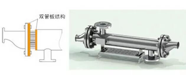 双管板换热器采用固定管板结构,管束不能抽出清洗,单管板换热器可采用多种结构型式,管束可以抽出清洗.对于温差较大的双管板换热器,简体上可加装波纹膨胀节;而单管板换热器除可考虑简体上加装波纹膨胀节外,常采用浮头或U型管型式来补偿.