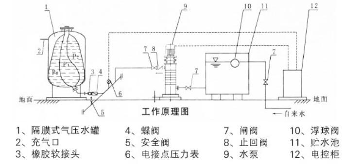 根据波义耳气体定律,质量的气体在温度下,压力与容积的乘积为常数。当水泵工作时,水送至给水管网的同时,多余的水进入气压水罐,水室扩大并将罐内的气体压缩,气室缩小,罐内的压力随之升高;压力升到高工作压力P2 时,电控柜切断水泵的电源,水泵停转,此时利用罐内被压缩气体的压力将罐内贮存的水送入给水管网,水室缩小,气室扩大,罐内压力也随之下降,当压力降低到 工作压力P1时,电控柜接通水泵电源,水泵重新启动,如此周而复始,不断运行,其工作原理见下图。